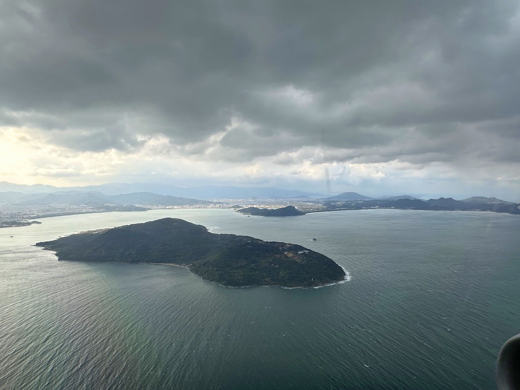 福岡空港着陸態勢の機内から能古島を撮影。