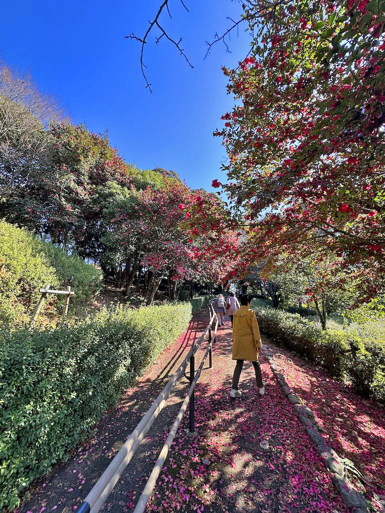 椿の花びら絨毯のスロープを登り・・