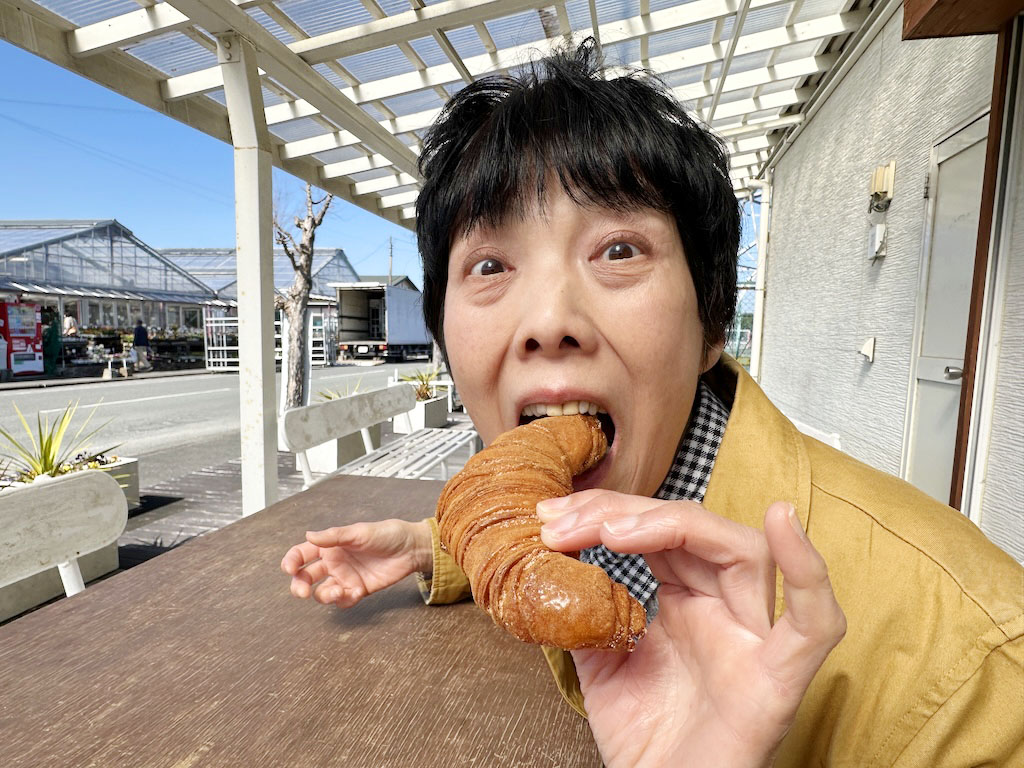 シナモンクロワッサンを頬張る妻。
