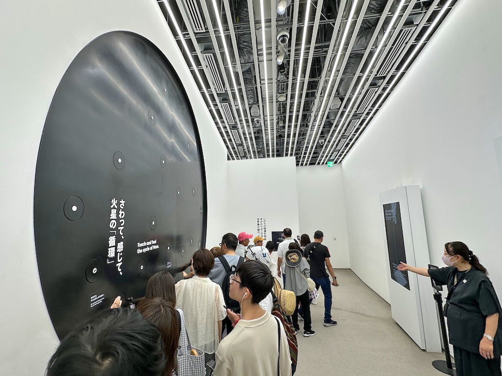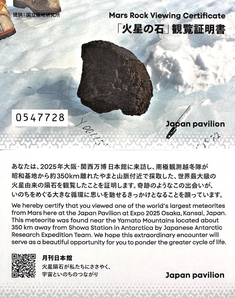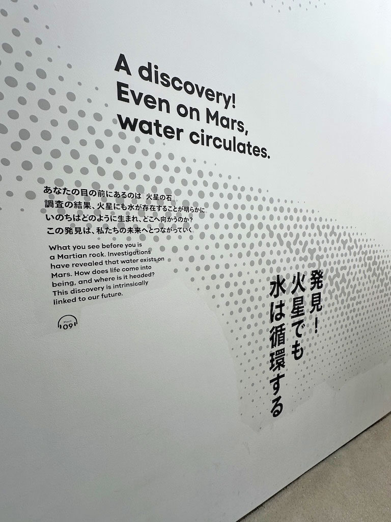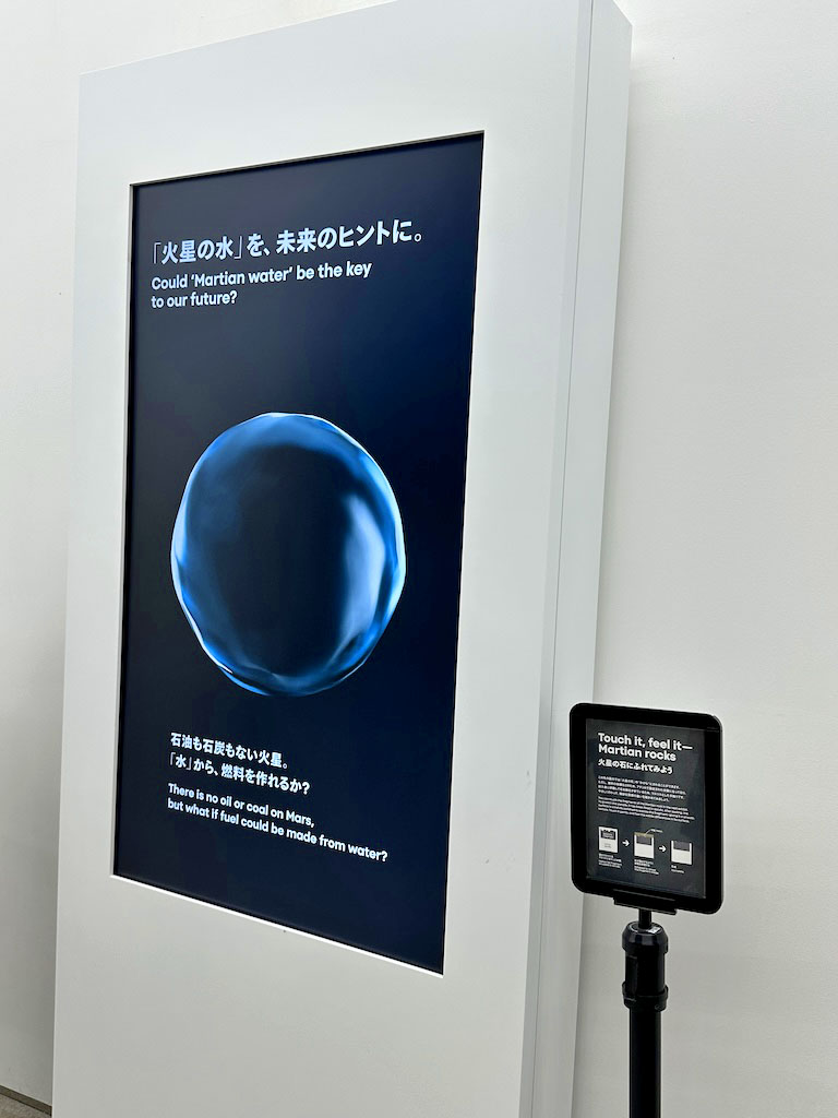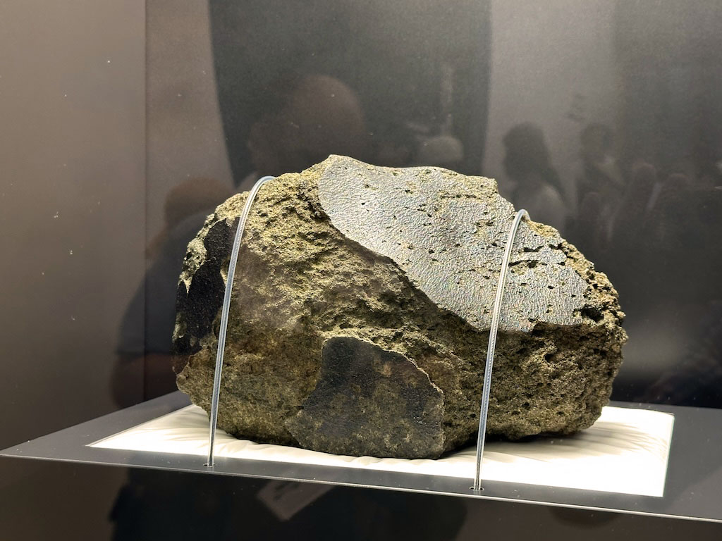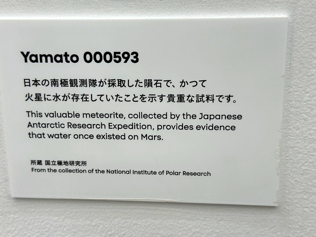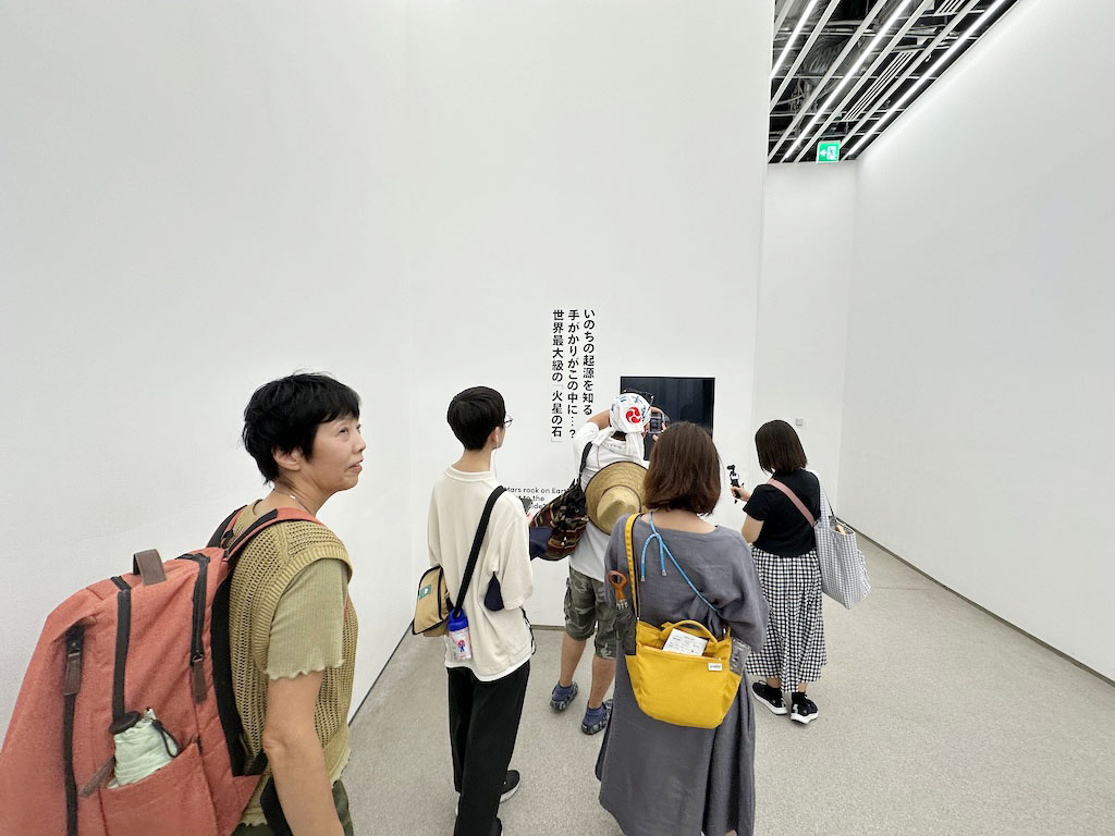 「世界最大級の火星の石」の展示に並ぶ妻。