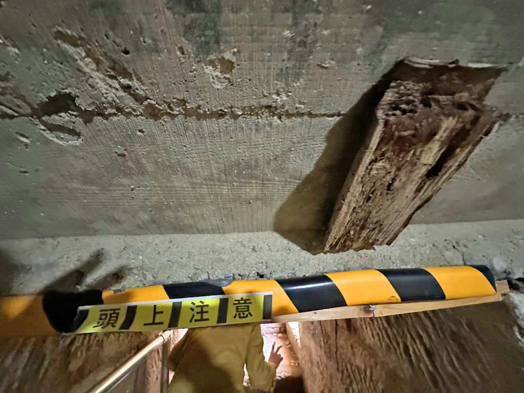 出口手前の天井の木片、